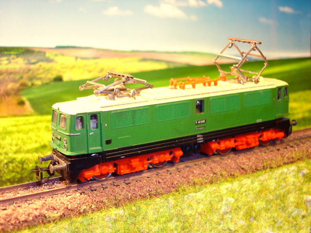 Az összehasonlító tesztkörök mezőnye. Balról jobbra: Zeuke E11, a most javított E42-es fűzöldjéhez hasonló kasznival, de házilag utánfestett tetővel. Majd egy eredeti állapotú, ugyancsak Zeuke E11, de a megszokott DR/DB zölddel és szürke tetővel. Majd egy Bttb-s BR242, a gyártó egyértelműen beazonosítható jegyeivel és felszereltségével, valamint a felújított E42. A vörös/fehércsík festésű Br211-es most nem került fel a pályára.