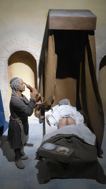 A katakombákban egy kis múzeum eleveníti fel a máltai gyógyítás stációit. A nagy pestisjárványban szörnyű hely volt ez is. Panoptikum mellett az eredeti gyógyító és elfekvő cellák emlékeztetnek a borzalmas kór által végzett pusztításra. A nagyobb termekben kis maketteken láthatjuk az akkori élet mindennapjait. (Lukács Csaba fényképe)