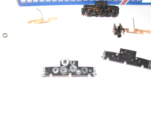 A mellékelt, meglehetősen igénytelen kartondobozban pedig ott volt az összes apróság: a két forgóváz-fél, a palástjuk darabokban, az összes fogaskerék, kardánok, áttételházak, áramszedőlemezek, kerekek, gumigyűrűk külön. A motor a rászerelt két lendítősúllyal, valamint a vezérállást imitáló, fekete kupak. Összerakási leírás nincs a dobozban, pedig a megszokott modellkísérő, ismertető mellett elférne.