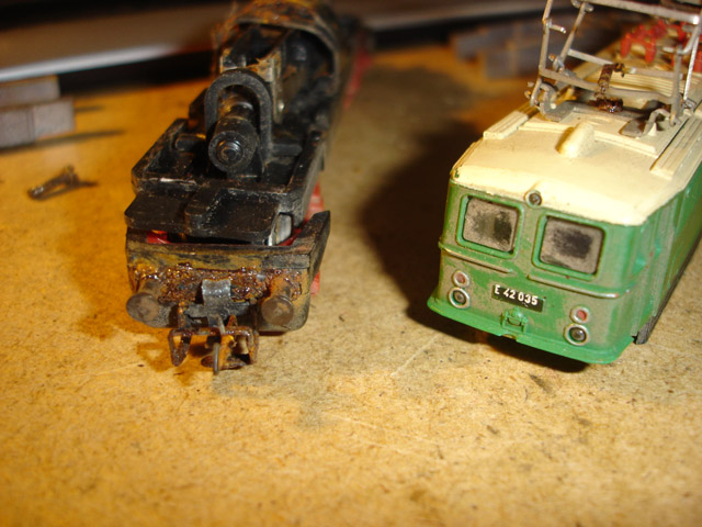 Az összehasonlító tesztkörök mezőnye. Balról jobbra: Zeuke E11, a most javított E42-es fűzöldjéhez hasonló kasznival, de házilag utánfestett tetővel. Majd egy eredeti állapotú, ugyancsak Zeuke E11, de a megszokott DR/DB zölddel és szürke tetővel. Majd egy Bttb-s BR242, a gyártó egyértelműen beazonosítható jegyeivel és felszereltségével, valamint a felújított E42. A vörös/fehércsík festésű Br211-es most nem került fel a pályára.