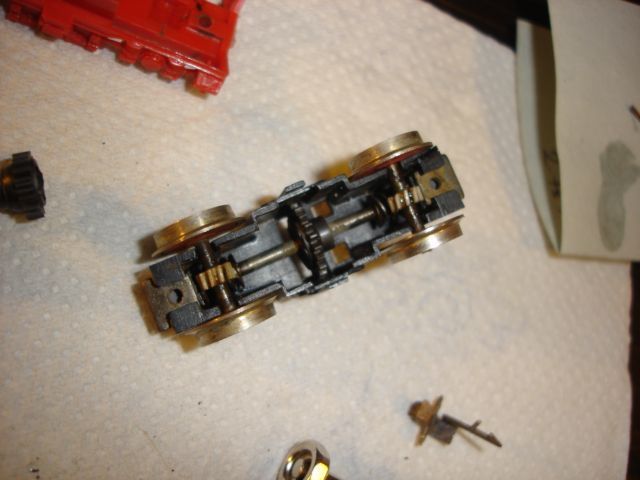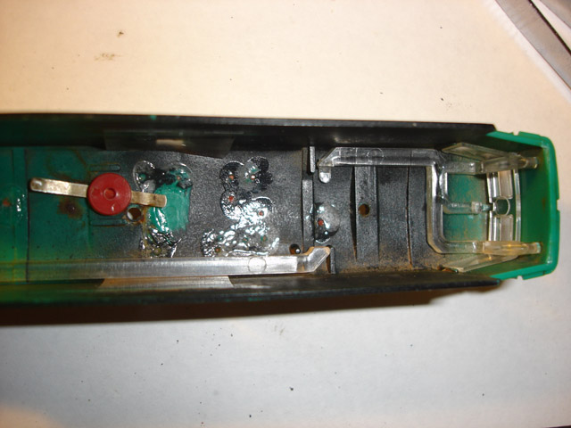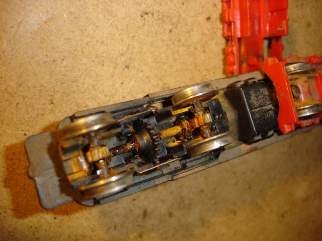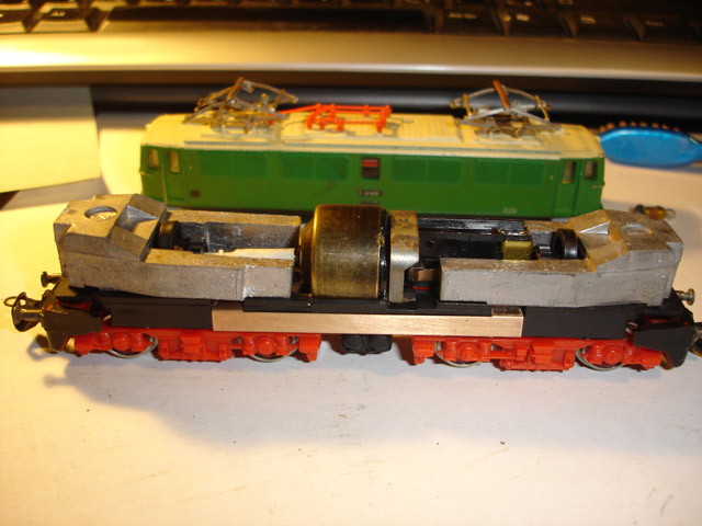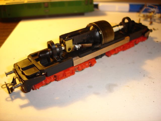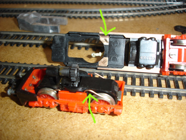 Az első próbakör nagyon keservesre sikeredett. Úgy viselkedett a mozdony, mintha nem kapna stabil tápfeszültséget. Mi lehetett az ok? Ha kicsit lenyomtam a mozdonyt a sínre, akkor nekiindult. Újból szétkaptam és rájöttem, hogy a képen látható áramszedő drótok nem feszültek eléggé a főkereten végigfutó rézlap alsó füleihez. Ez a rézlap szedi fel a kerekekről érkező áramot, majd a kaszniban helyet foglaló panel csatlakozófülei révén továbbítják a motorhoz. Egy apró hajlítás után máris tökéletes lett a kontaktus. Az egy kör szikrázó nyomai azonnal láthatók a frissen tisztított rézlapon.
