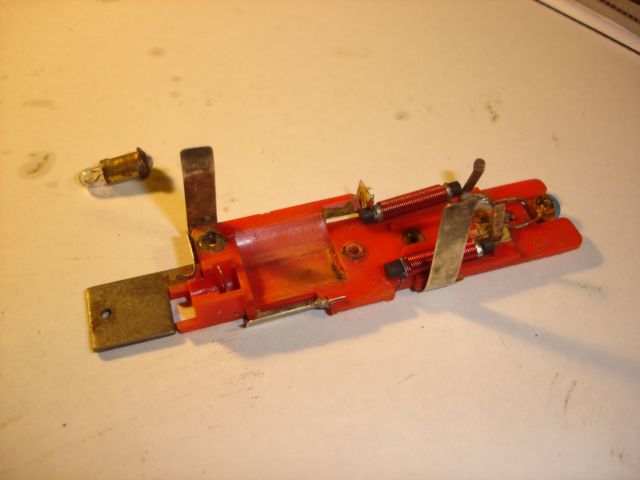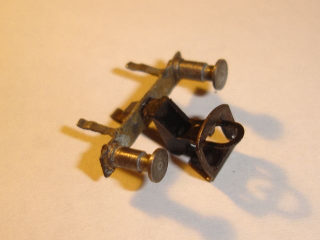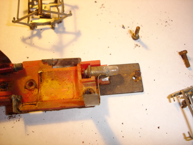 Mert ugye a rozsda itt sem kímélte a modellt. Az egyszerű acéllapon a csavarfurat átrozsdásodva. A réz csatlakozó és érintkező kapcsok mind oxidáltak. Viszont az izzó működőképes. Ebben a modellben nem irányváltó a világítás, viszont van hely bőven a későbbi átalakításra. Most azonban az eredeti állapot visszaállítása a cél, ezért meg kell tisztítani az alkatrészt.