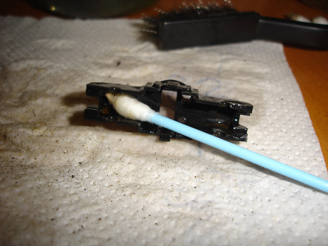 Egyenként bekerültek a kis alkatrészek a fürdőbe, majd drótkefés takarítás és olajozás után vissza az eredeti helyükre. Ajánlatos a kefe mellett egy vékony, lombfűrészéllel is végigsimogatni a fémcsigák fogai között, hogy biztosan kisimuljanak a fogak, mert ellenkező esetben az ott maradó rozsdapiszkok megakaszthatják az áttételt, szétmarhatják a műanyag fogaskerekeket.