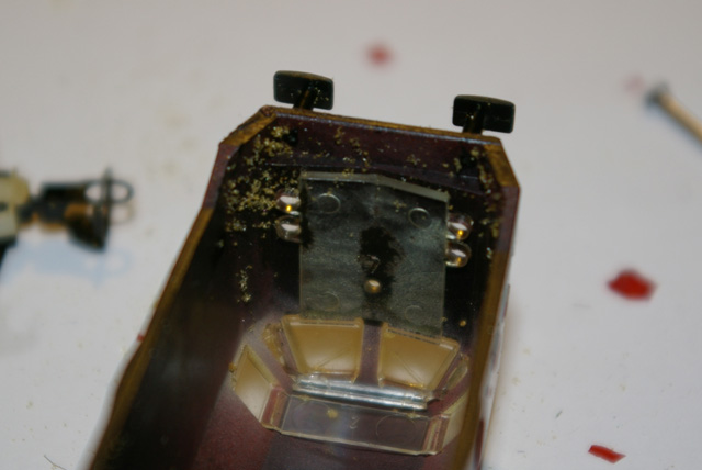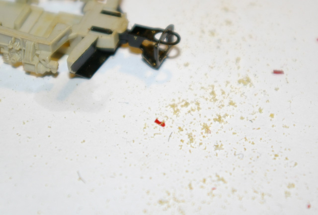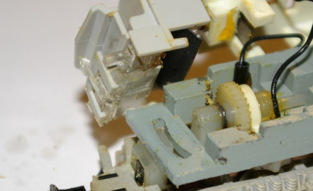 Amikor szétszereltem a modellt ez a kép tárult elém. A túlzsírzott hajtásban a zsírba ragadva ott voltak a szivacsszemcsék, akárcsak az összes műanyagalkatrészen, amire vagy a sztatikus vonzás miatt, vagy a szétfröccsent zsíradék miatt tapadt a műanyag por.