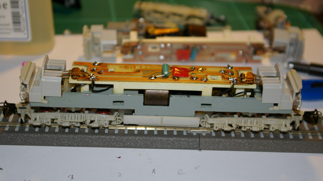 Természetesen a fémöntvény főkeretet is jól meg kellett tisztítanom, hogy sehol ne maradjon szivacspor. A mosás után visszakerültek a forgóvázak, mindkettőt már az új ómegák rögzítik. Kicsit szorulnak még, de ha megjáratom a mozdonyt, ráadásul sok ívben, akkor hamar bekophatnak és minden tökéletesen fog működni a kitakarított mozdonyban.
