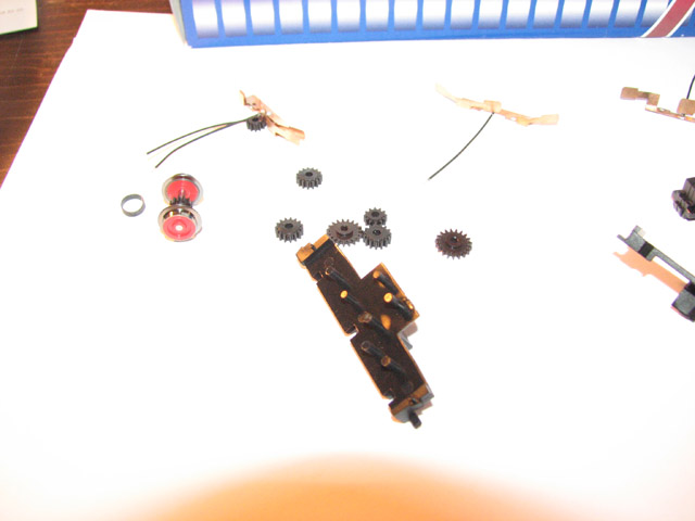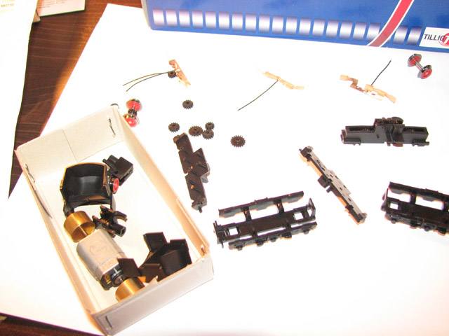 A mellékelt, meglehetősen igénytelen kartondobozban pedig ott volt az összes apróság: a két forgóváz-fél, a palástjuk darabokban, az összes fogaskerék, kardánok, áttételházak, áramszedőlemezek, kerekek, gumigyűrűk külön. A motor a rászerelt két lendítősúllyal, valamint a vezérállást imitáló, fekete kupak. Összerakási leírás nincs a dobozban, pedig a megszokott modellkísérő, ismertető mellett elférne.