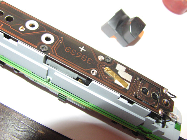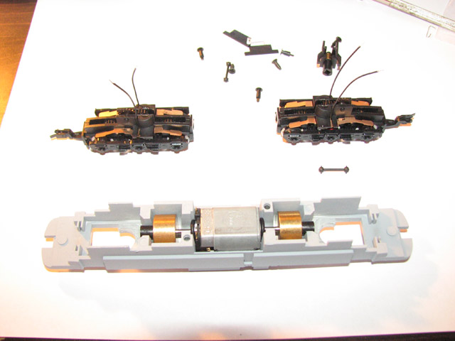 Következő lépés a két vázfél összepattintása. Ragasztani nem kell és tilos! Elég egy rosszul irányzott csepp és vége a hajtásnak. Az áramszedő lemezek gyárilag egybe vannak forrasztva a kivezető dróttal. A lemez középső kiszélesítése nagyobb, mint a két szélső, mert a középső kerék az ívek miatt oldalra is többet mozdul. Ha ezzel kész vagyunk, akkor tegyük félre és jöhet a másik forgóváz.