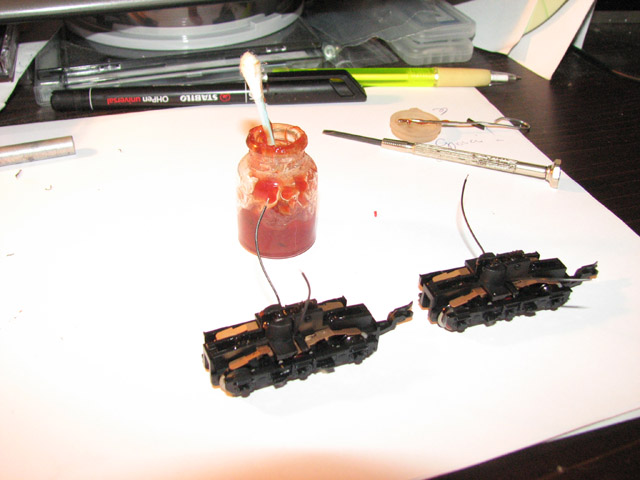 Félrerakva a mozdonytestet, ugorjunk a sűrűjébe. No ne annyira sűrűbe, mert a zsírzás nagyon fontos lépése a munkánknak. Tanult mesteremtől, Csíkos Mestertől okultam, hogy az ideális mozdony-hajtáskenés a klasszikus KZS, azaz Kenő Zsír (az a bordós trutymó, szocreál tégelyben) és finom, műszerolja 1:1-es keveréke. A művelethez tökéletesen megfelel egy gyógyszeres üvegcse, ebbe valami tiszta eszközzel átpiszkálunk két-három újbegynyi zsírt, majd ezt lenyomkodva, még egyszer annyi szintre töltjük az olajjal. Ezután egy levágott végű fültisztítóval jól elegyítjük.