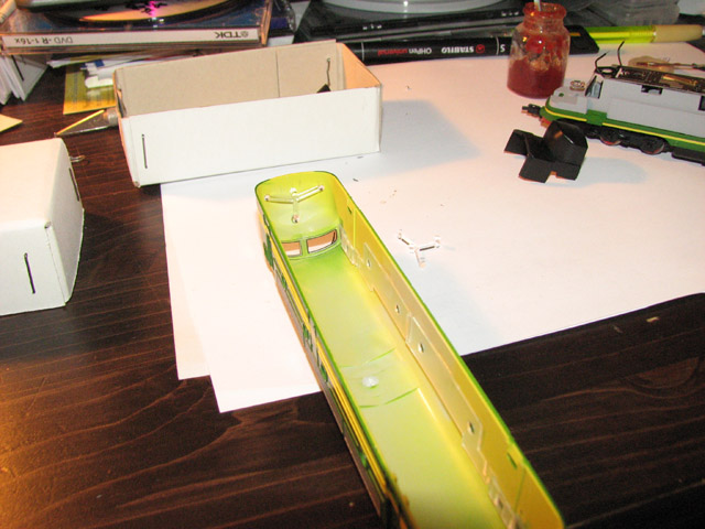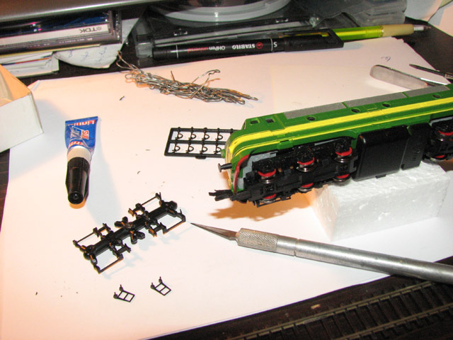 Ezért első körben felkerülnek az elengedhetetlen alkatrészek: tuskómerevítők, létrák, ütközők. Itt már javasolt a pillanatragasztó használata. hasznos egy kis papírlapra kinyomni egy csöpp ragasztót, majd azt kis dróttal felvinni az alkatrészre.